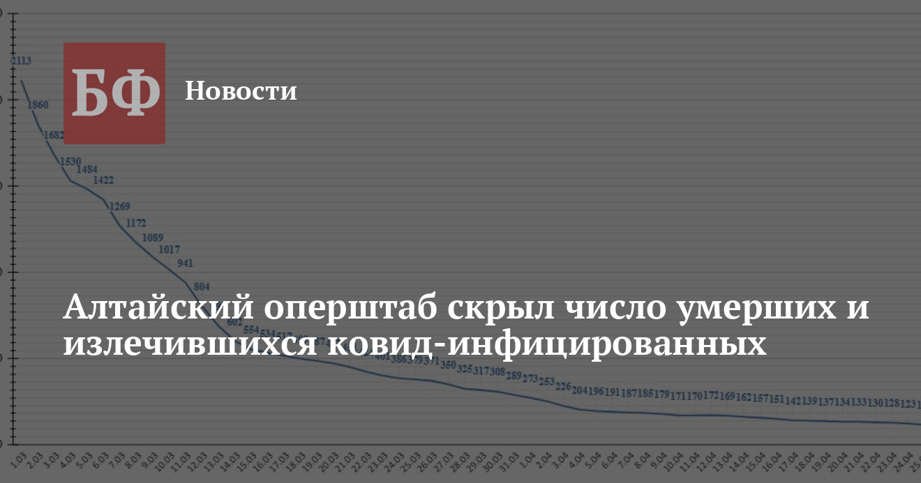Наибольшее число заболевших за сутки традиционно выявили в Барнауле — 30 человек. В остальных муниципалитетах заболеваемость колеблется от 1 до 10 случаев за день. Таким образом, за все время пандемии в Алтайском крае зарегистрировали 266 084 случаев заболевания. Данных об умерших и выздоровевших в новой статистике нет. Есть лишь значение «выбывшие», число которых составляет 264 671 человек. Очевидно, этим термином власти обозначают суммированные показатели по погибшим и выписавшимся больным, коих по состоянию на 24 апреля 10 179 и 254 369 человек соответственно. По каким причинам власти пошли на такой шаг — официально не сообщается. Среди наблюдателей бытует версия, что это может быть связано с разночтениями в статистике. Тем не менее, на федеральном портале «Стопкоронавирус.рф» эти данные присутствуют. Согласно им, за 25 апреля в Алтайском крае умерли три пациента, а выздоровели 420 человек.