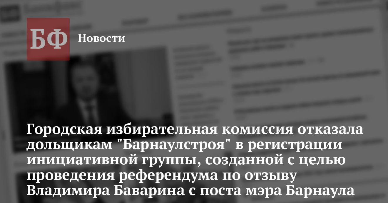Как сообщили в избирательной комиссии города Барнаула, на днях горизбирком рассмотрел вопрос о регистрации инициативной группы, сформированной обманутыми дольщиками «Барнаулстроя» с целью проведения референдума по отзыву Владимира Баварина с поста мэра Барнаула.