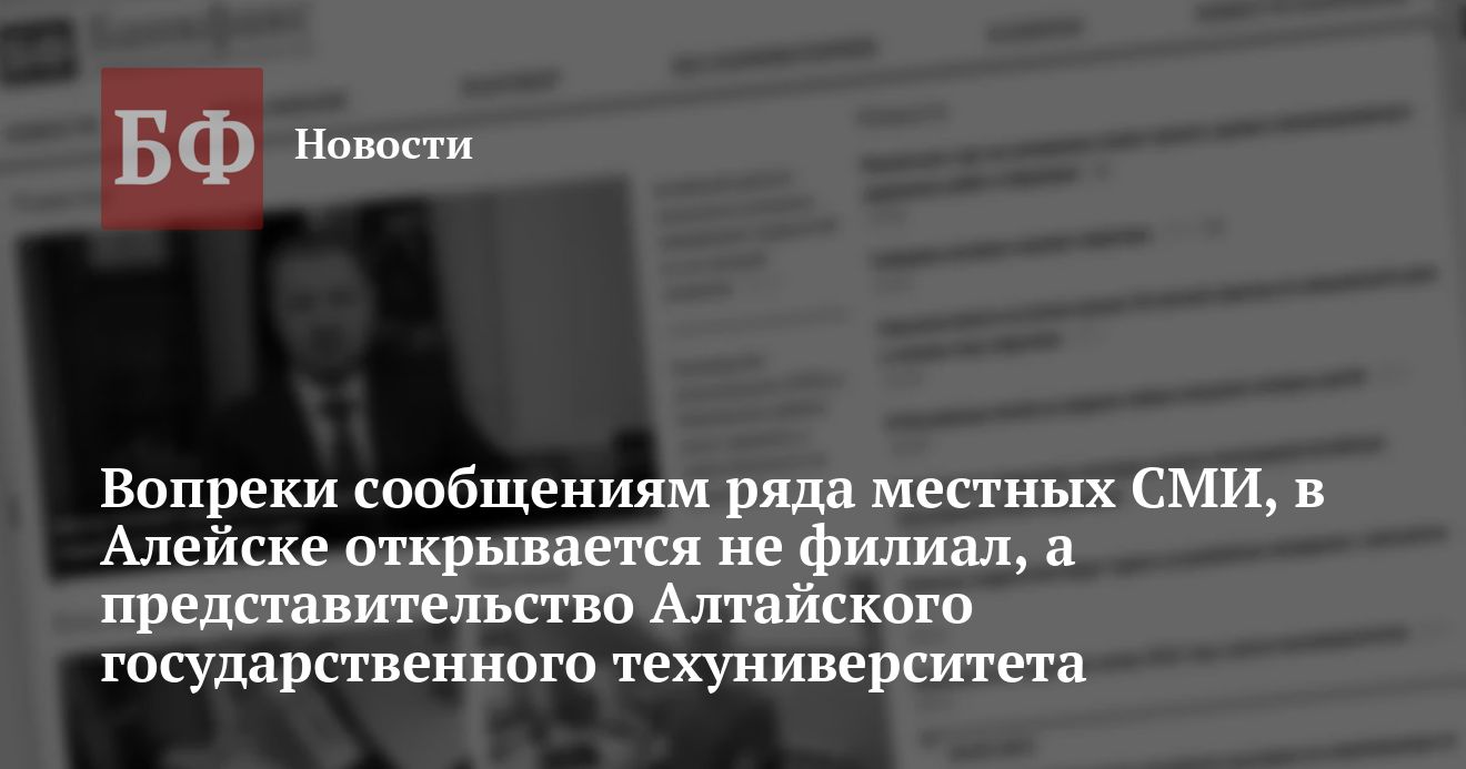 На минувшей неделе в ряде районных газет прошла информация об открытии в г. Алейске филиала Алтайского государственного технического университета (АлтГТУ). Сообщалось также, что обучение будет проходить в очной и заочной форме по 4 специальностям: менеджмент; программное обеспечение вычислительной техники и автоматизированных систем; автомобиль и автомобильное хозяйство; технология пищевых производств, хранение и переработка зерна, мясомолочное производство.