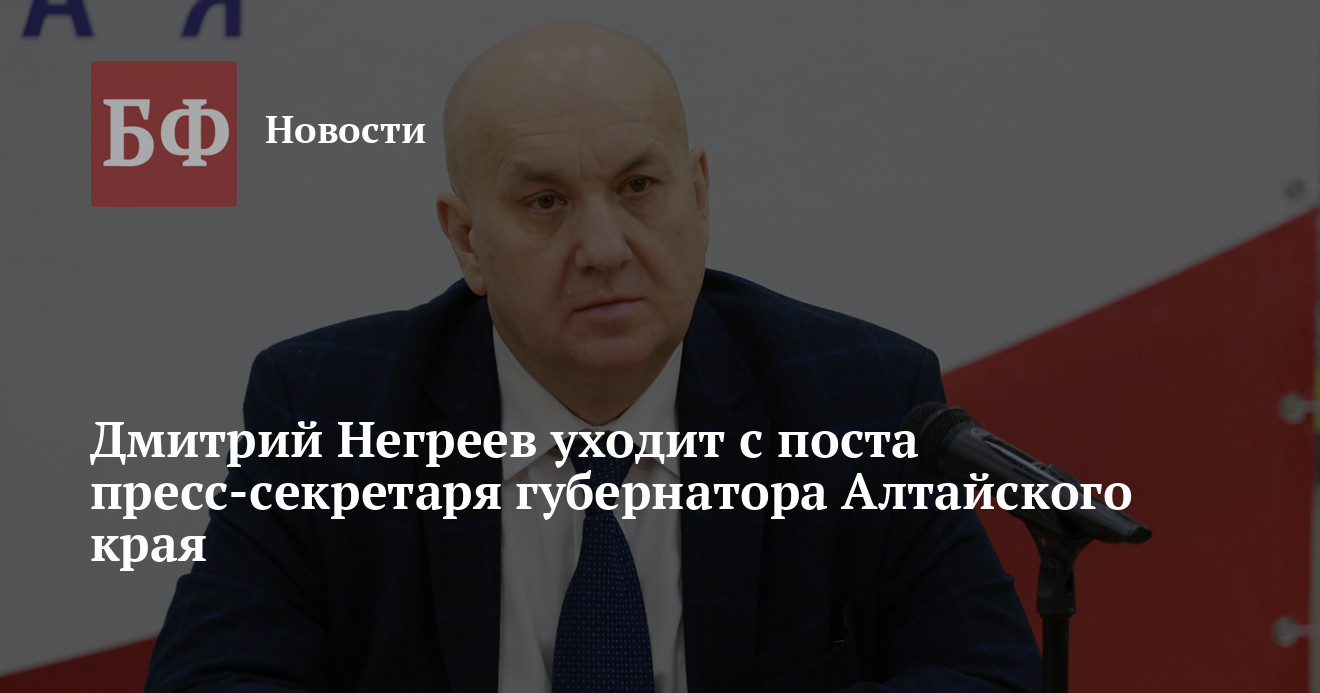 Известный алтайский медиа-деятель Дмитрий Негреев покидает пост начальника департамента администрации губернатора и правительства Алтайского края по информационной политике и пресс-секретаря главы региона. Об этом он сообщил краевым СМИ.