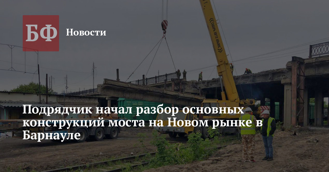 ООО «Барнаульское ДСУ № 4», которое является подрядчиком реконструкции моста на Новом рынке в Барнауле, 5 июня начало разбор конструкций. Как сообщает Telegram-канал «Мост», компания приступила к демонтажу балок на восьмипролетном путепроводе, работают краны.