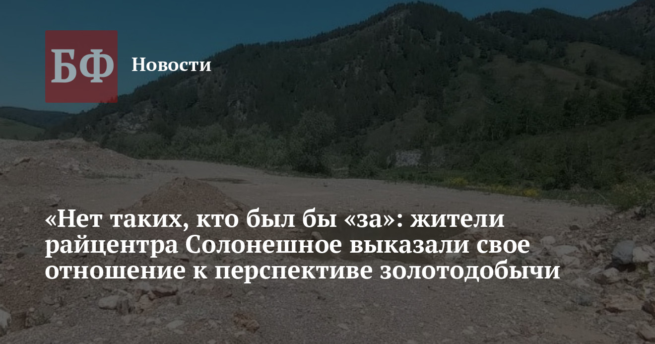 Всего несколько жителей райцентра Солонешного из числа участвовавших в опросе общественного мнения сельчан поддержали намерения «Артели Солнечной» начать золотодобычу на месторождении «Россыпь реки Щепета и реки Солонешная». Компания добивается разрешения на начало своей деятельности уже не первый год, и относительно недавно получила в аренду лесные участки, где планируется вести добычу. Тем не менее, большая часть местных жителей выступает против таких перспектив. По их мнению, деятельность золотодобытчиков приведет район чуть ли не к локальной экологической катастрофе. Об этом пишет «Толк».