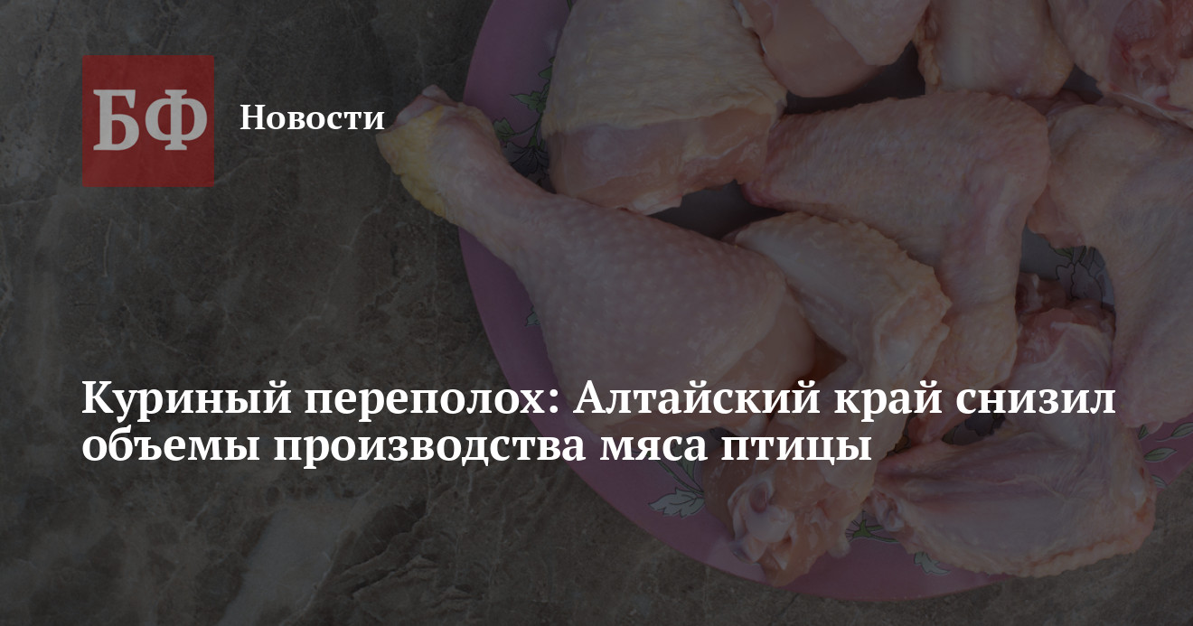 Алтайский край теряет позиции по производству курятины. По данным регионального Минсельхоза, за 5 месяцев текущего года в крае произведено 28 тысяч тонн мяса птиц. Это 90% к аналогичному периоду 2021 года и 82% - 2020-го. Как объясняют в ведомстве, снижение производства связано с крупным пожаром в филиале «Алтайский бройлер» АО «Куриное царство» в июле 2021 года и закрытием в прошлом году ООО «Новоеловская птицефабрика» (по сведениям сайта холдинга «Алтайские закрома», ежегодно птицефабрика производила порядка 5,5 тысяч тонн мяса).