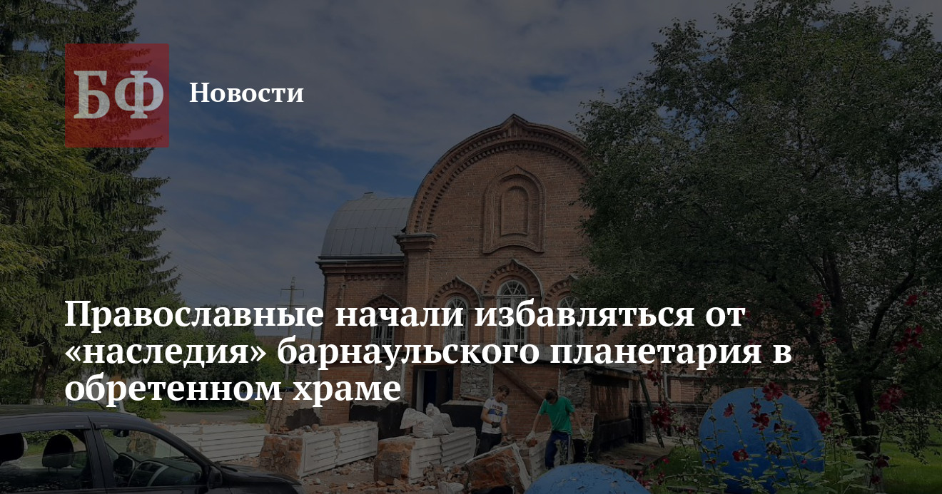 У здания Крестовоздвиженского храма в барнаульском парке «Изумрудный» начали демонтировать архитектурное «наследие» до недавнего времени размещавшегося там планетария. Рабочие уже снесли появившиеся в советские годы колонны, а вскоре, как рассказал «Амителу» настоятель храма Михаил Бень, снесут и бетонные сферы на постаментах, которые изображали планеты солнечной системы. По словам священнослужителя, сделать это необходимо, чтобы привести здание к его первоначальному облику, как того требуют власти.