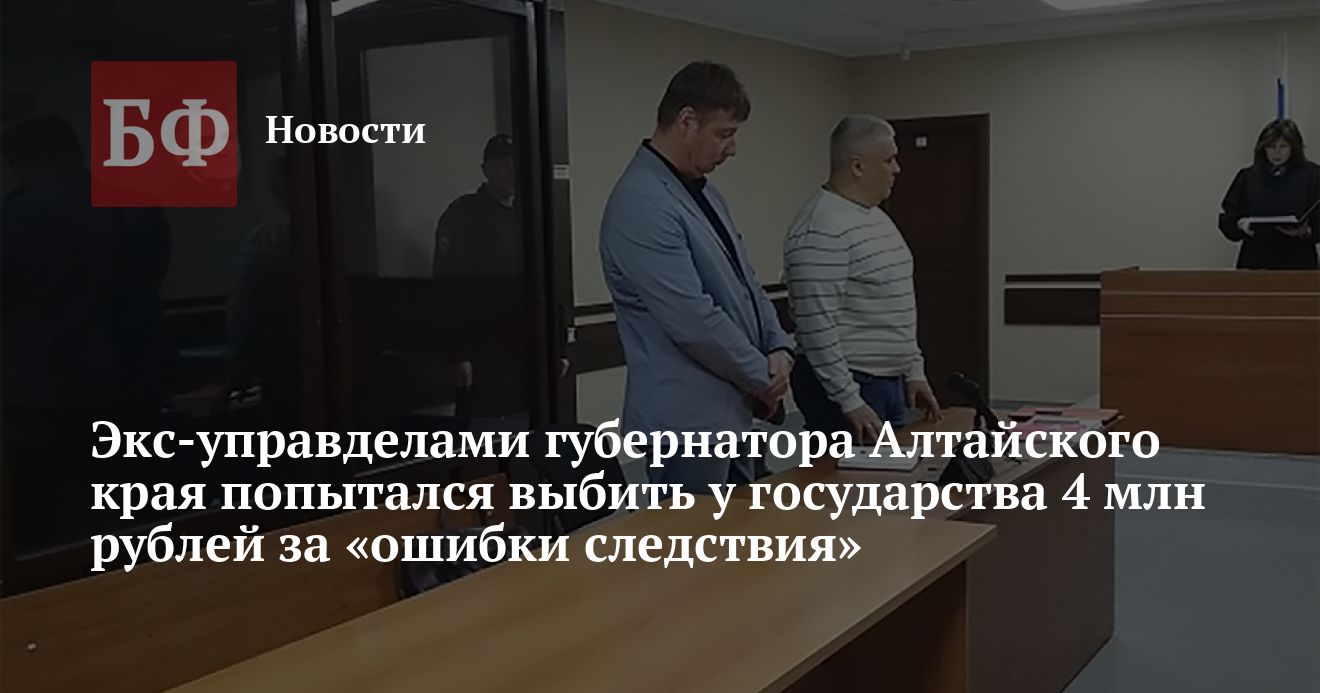 Экс-управляющий делами губернатора Алтайского края Алексей Белобородов, ранее осужденный за присвоение и взяточничество, пытается взыскать с государства 4 млн рублей в качестве компенсации морального вреда за незаконное уголовное преследование по нескольким статьям, вина по которым не подтвердилась. По данным судебных картотек, вначале Белобородов подал иск в Центральный районный суд Барнаула, но тот удовлетворил требования экс-чиновника лишь на 180 тысяч рублей, отвергнув большую часть его доводов. Сейчас один из ответчиков пытается вовсе оспорить это решение в Алтайском краевом суде.