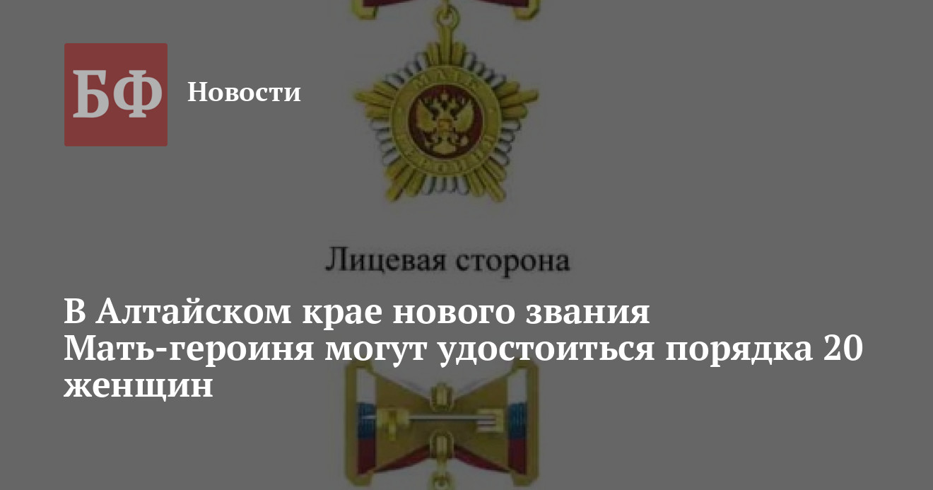 По подсчетам Минсоцзащиты Алтайского края, в регионе около 20 женщин могут получить звание Мать-героиня за рождение 10 и более детей, которое 15 августа установил президент РФ Владимир Путин. Получившим его матерям, как указывает ведомство, будут выдавать вознаграждение в размере 1 млн рублей.