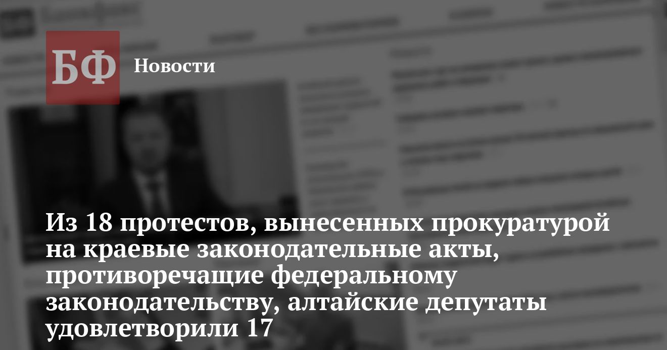 На очередной сессии краевого Совета народных депутатов, прошедшей 29 июня были рассмотрены протесты, которые внесла прокуратура Алтайского края на 18 законодательных актов, принятых крайсоветом в этом году и в конце 1999 года.