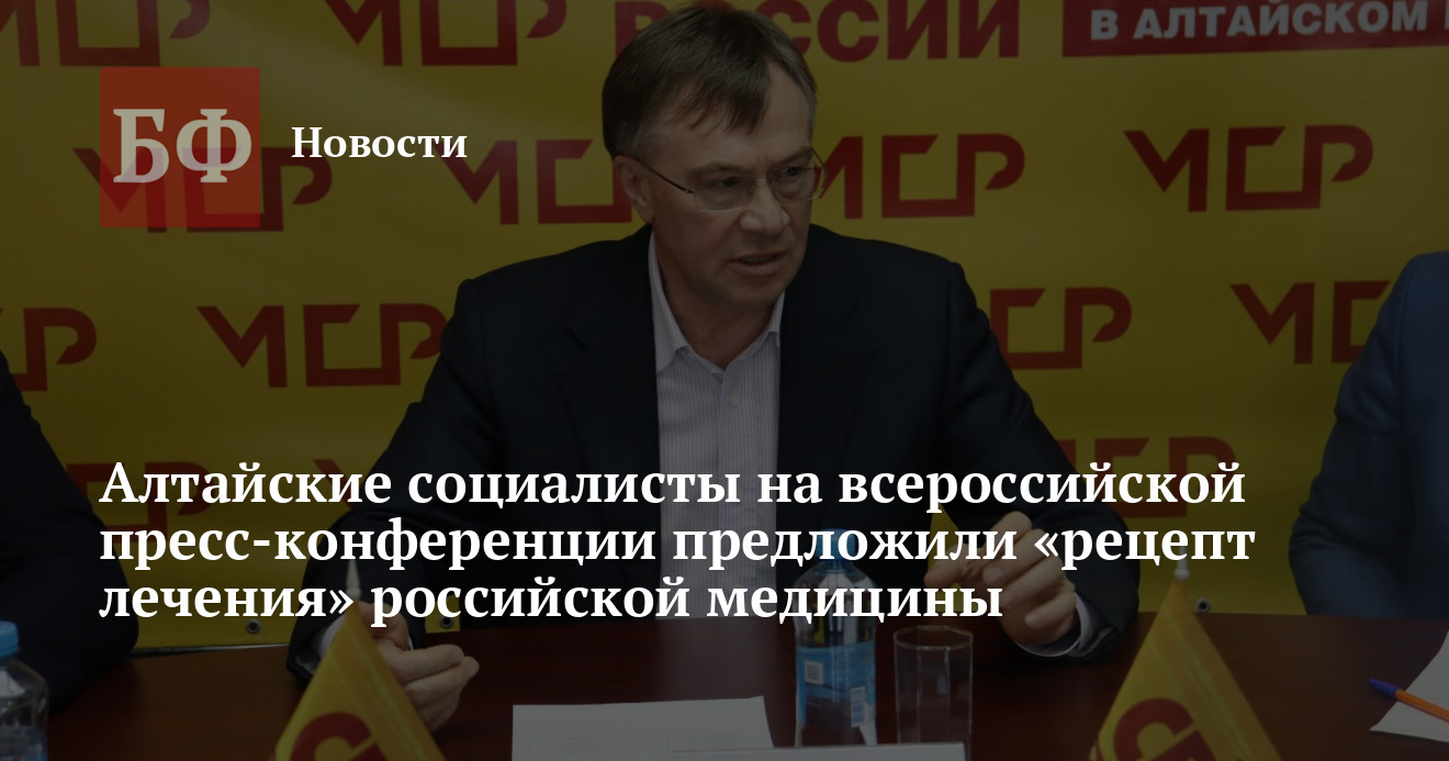 24 августа Алтайское краевое отделение партии «Справедливая Россия — За правду» приняло участие во всероссийской пресс-конференции, на которой прозвучало требование реформировать систему здравоохранения России. Социалисты в Барнауле постарались ответить на вопрос о том, как «вылечить» медицину, и пришли к выводу, что необходимы ликвидация системы ОМС, серьезное прямое бюджетное финансирование и рост зарплат медиков. Среди выступивших спикеров депутат Госдумы, лидер алтайских справедливороссов Александр Терентьев, депутаты краевого Заксобрания фракции «СР-ЗП» Александр Молотов, Евгения Боровикова и Людмила Суслова, сказано на партийном сайте.