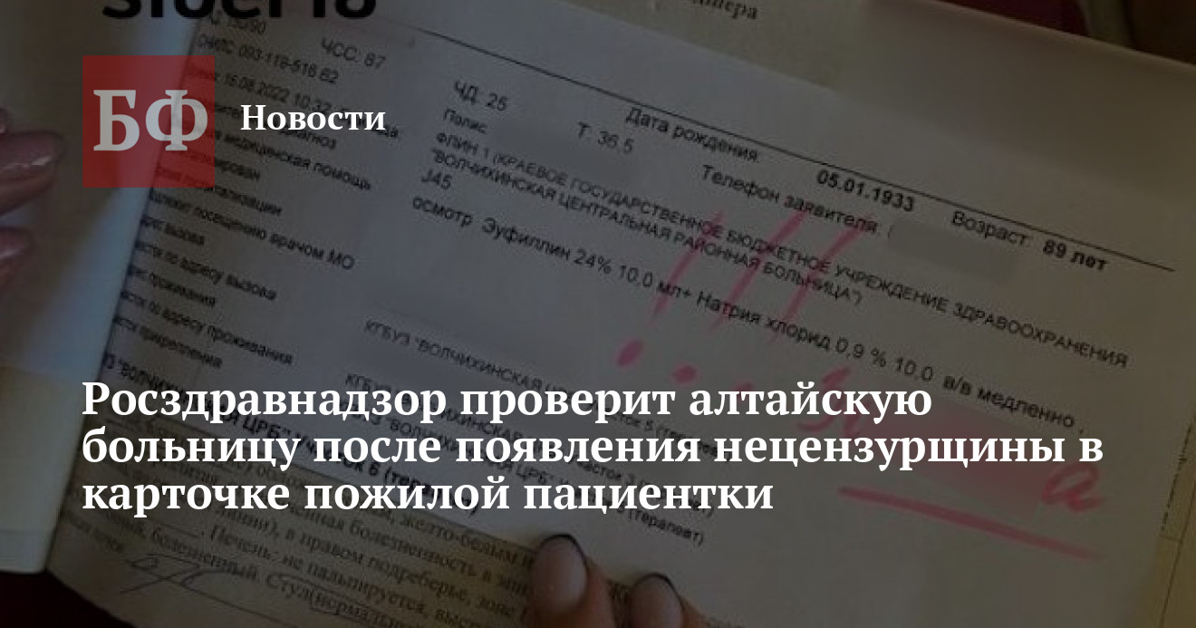 Минздрав Алтайского края официально прокомментировал ситуацию с появлением нецензурного слова «з*****а» (надоела) в медицинской карте 89-летней пациентки Волчихинской ЦРБ, которая часто вызывала «скорую». В пресс-службе ведомства заявили, что оставленная медиками надпись «не адресовалась пациенту», но не уточнили, кто же на самом деле должен был ее увидеть и для чего в больнице обменивались такой информацией. Также в министерстве сообщили, что «виновные специалисты понесут наказание», но не раскрыли суть санкций. Между тем публикация об инциденте разлетелась по региональным и федеральным интернет-ресурсам. Росздравнадзор объявил о проведении проверки в ЦРБ.