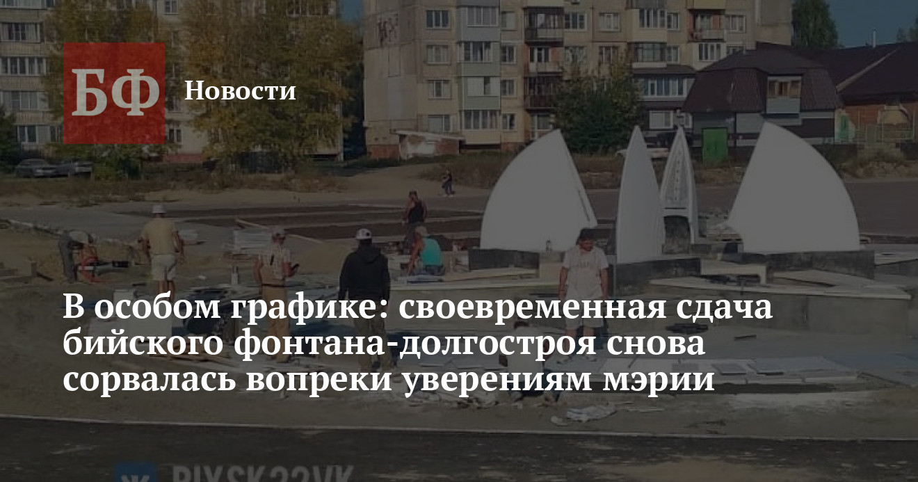 Барнаульское ООО «Красный кит» не успело в срок закончить строительство фонтана в будущем парке микрорайона Зеленый Клин за ТРЦ «Ривьера». Работы требовалось завершить до 31 августа. Но, как сообщает «Бийск 22» и следует из фотографий очевидцев, фонтан по-прежнему не готов. При этом 20 августа региональное отделение Общероссийского народного фронта (ОНФ) призывало администрацию наукограда «ускорить» подрядчика, но чиновники ответили, что работы идут в графике и беспокоиться не о чем.