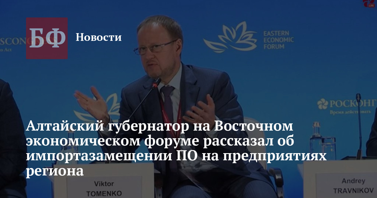 Губернатор Алтайского края Виктор Томенко 7 сентября принял участие в сессии Восточного экономического форума (ВЭФ) «Восток России 2.0. Региональные драйверы цифрового развития в новой реальности». В ходе нее глава региона рассказал об импортозамещении программного обеспечения на примере промышленности края, а также высказал предложение на тему того, как этот процесс можно было бы ускорить в масштабах страны. Об этом сообщает сайт регионального правительства.
