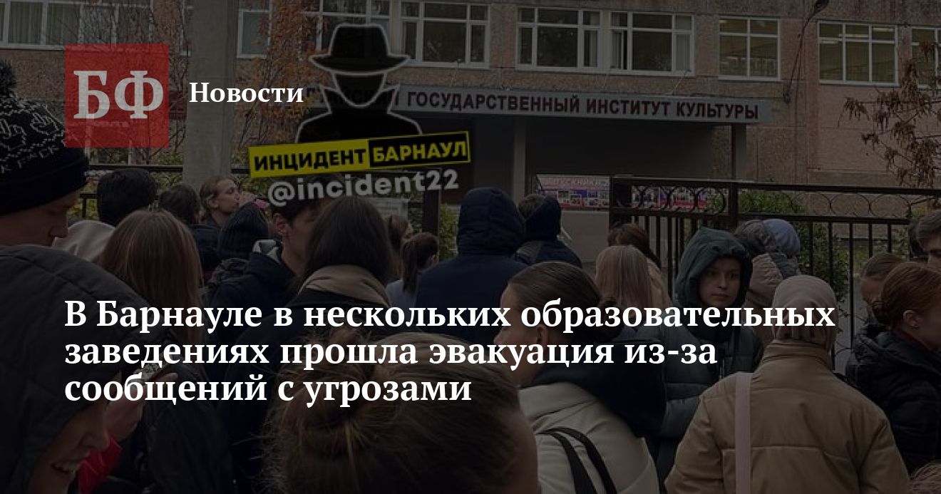 Подписчики сообщества указывают, что студентов РАНХиГС по неизвестной причине эвакуировали из помещений вуза. «Всех отогнали от территории и сказали ехать домой», — рассказывают студенты. 10 октября в том же сообществе появлялись сообщения, будто и в других заведениях эвакуировали учащихся. В частности, пользователи упоминают Алтайский госинститут культуры и одну из барнаульских школ. «Точно знаю про школу № 51. Всех детей отпустили с последних уроков. Учителя тоже ушли рано», — написала одна из пользователей и указала, что в школы будто бы поступили сообщения о минировании.
