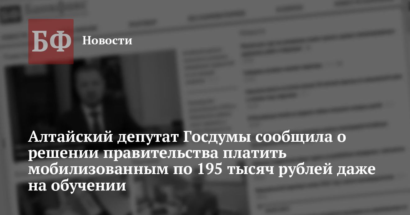 Как передает алтайский думец со ссылкой на министра финансов РФ Антона Силуанова, правительством РФ принято решение о том, что ежемесячные выплаты в размере 195 тысяч рублей всем мобилизованным будут начисляться с момента их мобилизации. До этого за период нахождения на учебных базах до отправки в зону боевых действий они получали не больше 27 тысяч рублей. Это решение Антон Силуанов озвучил на пленарном заседании ГД.