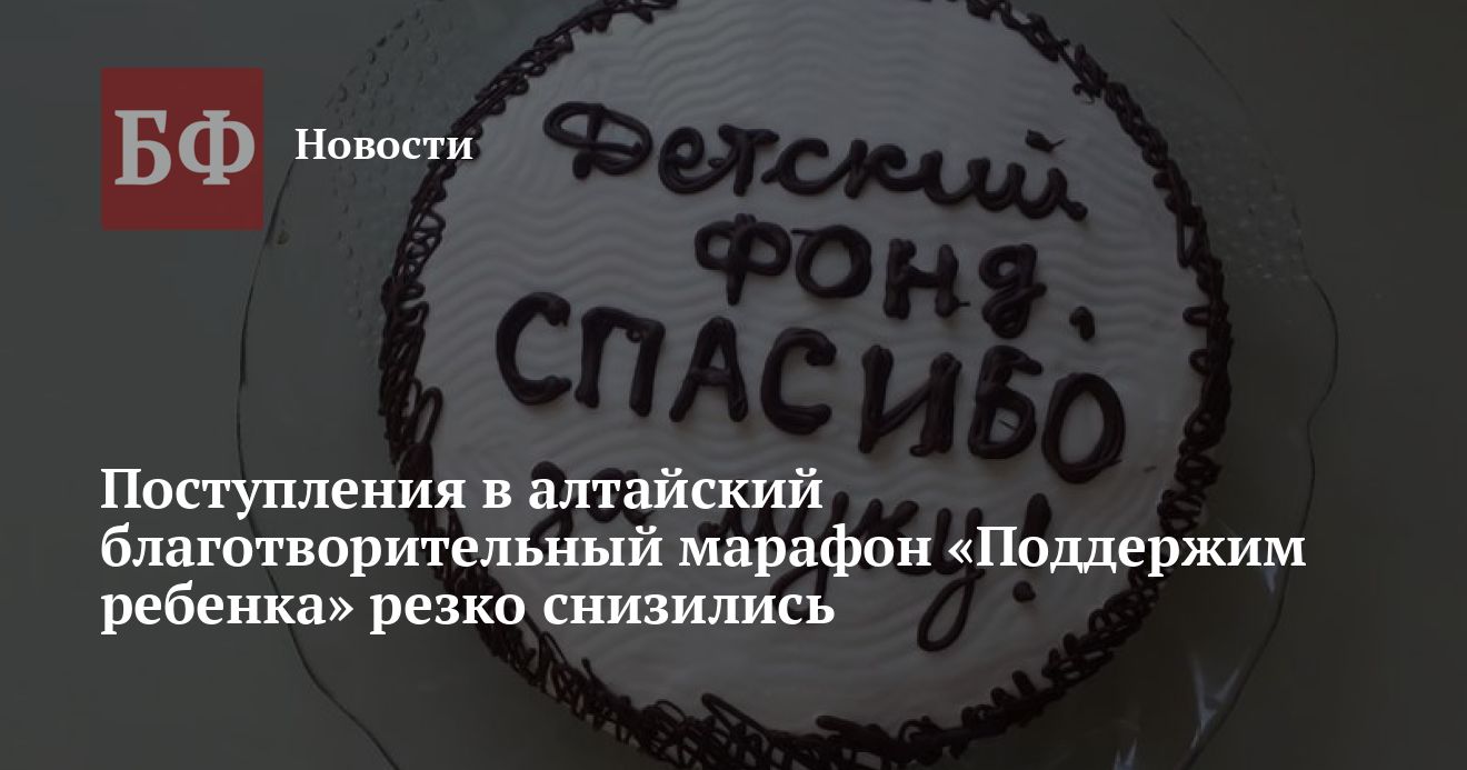 20 октября на сайте ГТРК «Алтай» появилась публикация, согласно которой поступления на счета благотворительного марафона «Поддержим ребенка» снизились, поэтому «дети могут остаться без поддержки на следующий год». Как сказано в материале со ссылкой на Оксану Овчинникову, раньше в рамках марафона удавалось собирать до 18 млн рублей, в прошлом году благотворители перечислили только 7 млн рублей, а с начала 2022 года поступило всего 2,4 млн рублей. Отметим, что по данным сайта краевого отделения РДФ, по итогам 2021 года было собрано 13 523 277 рублей. В обнародованном отчете за прошлый год фигурирует та же сумма.