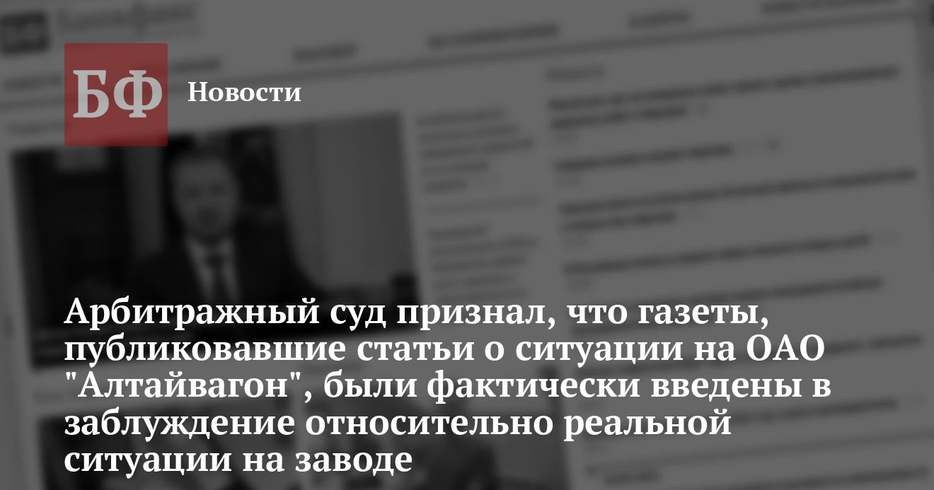 21 августа прошло заседание Арбитражного суда Новосибирской области, рассмотревшего иск о защите деловой репутации ОАО «Алтайвагон» к издательскому дому ООО «Сибирь-пресс», издающему ряд газет, активно задействованных в кампании против алтайских вагоностроителей. Исковое заявление, требующее возмещения значительной суммы ущерба, было привязано к одной из публикаций в газете «Аргументы и факты Сибирь» за май 2002 года.