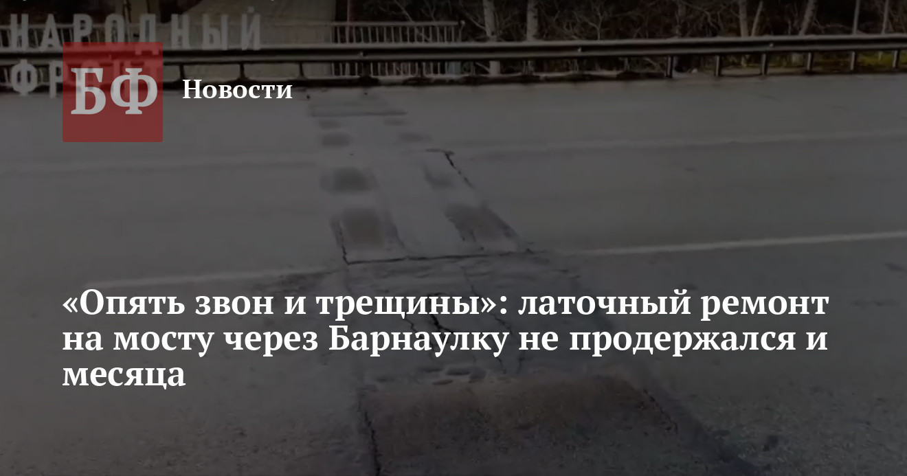 31 октября на странице алтайского отделения ОНФ рассказали о неудачном ремонте автомобильного моста через Барнаулку по шоссе Ленточный Бор. «Фронтовики» сообщили, что несколько недель назад по «сигналу» ОНФ здесь провели латочный ремонт, но дорожное покрытие снова разрушается. «Еще и месяца не прошло с момента, когда после очередного сигнала, дорожники сделали очередную латку деформационного шва на мосту через Барнаулку по шоссе Ленточный Бор. Но опять там звон и трещины, впору говорить о новой городской легенде. Где-то есть домовые, а в столице Алтайского края, видимо, завелся звонкий мостовой», — иронизировали общественники. На видео к публикации слышно, как объект «звенит», когда машины проезжают по «прорехе». В ОНФ призвали региональный Минтранс взять ситуацию на контроль и провести качественный ремонт деформационного шва.