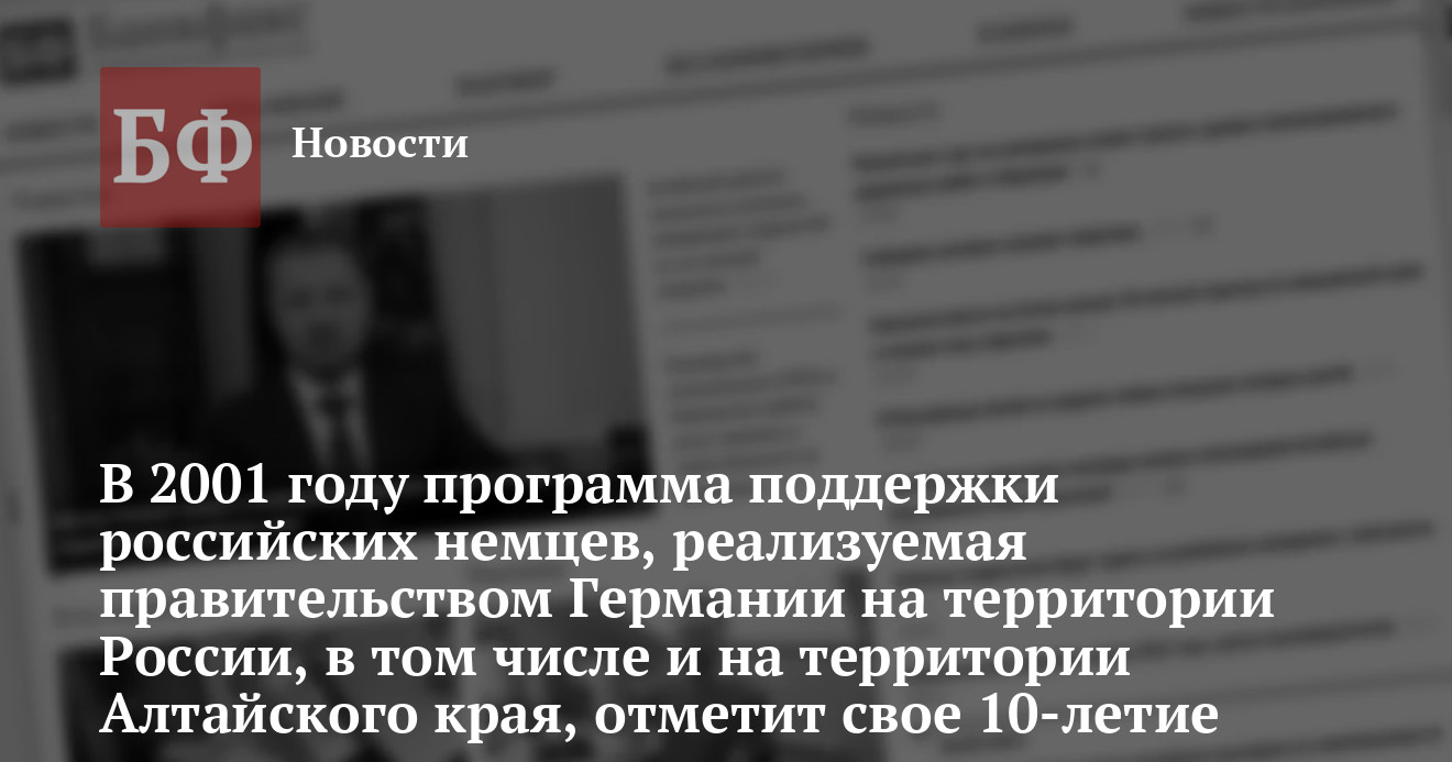 Как сообщил в ходе своего недавнего визита на Алтай руководитель департамента Министерства внутренних дел ФРГ Франк Вилленберг, за время реализации данной программы в Алтайский край, где проживает почти пятая часть всех российских немцев, германское правительство инвестировало 143 млн немецких марок. Эти средства были направлены на организацию центров встреч в районах компактного проживания немецкого населения в крае, на строительство жилья для алтайских немцев, на создание системы обучения немецкому языку, на поддержку малого предпринимательства и др. цели.