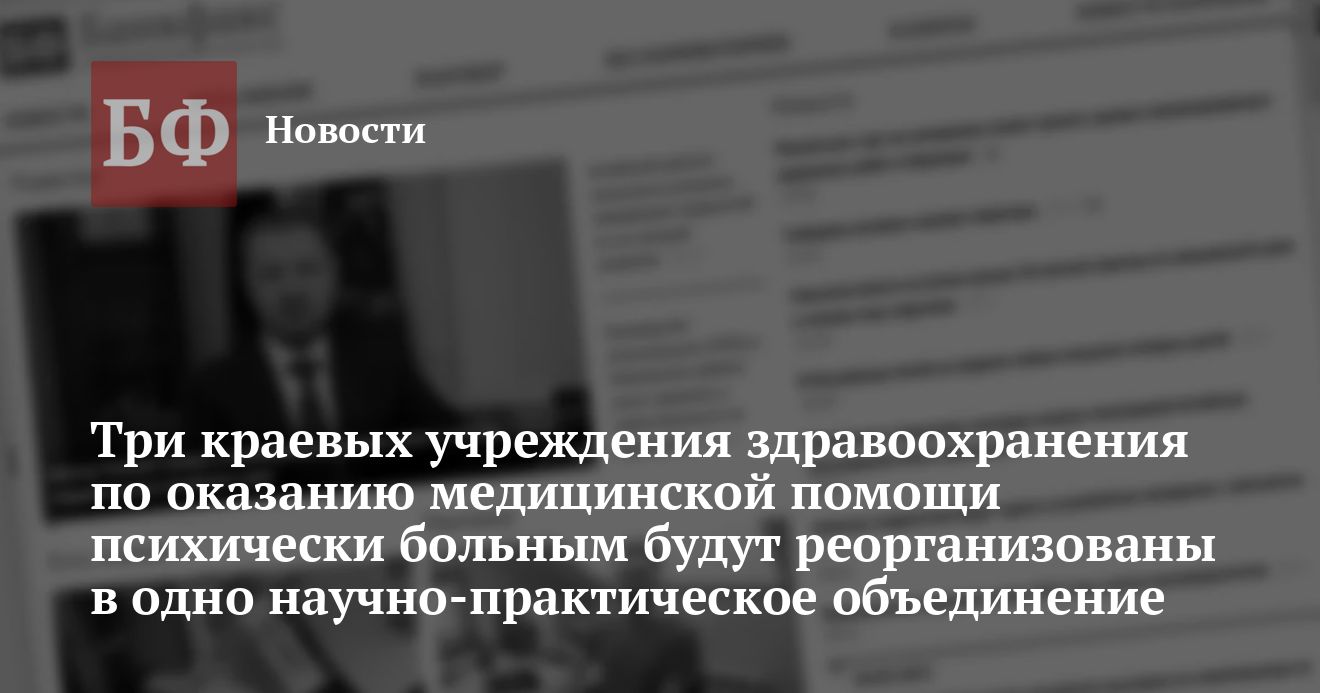 Постановлением администрации края от 31 июля краевые государственные учреждения здравоохранения «Алтайский краевой клинический психоневрологический диспансер», «Краевая поликлиника неврозов» и «Алтайская краевая клиническая психиатрическая больница» будут объединены в КГУЗ «Алтайская краевая клиническая психиатрическая больница» (Научно-практическое объединение).