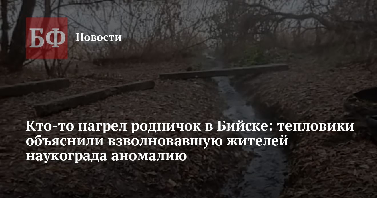 На днях жители в сообществе «Левый Бийск» обратили внимание на высокую температуру родника в районе старого центра возле сквера им. Фомченко. Люди здесь иногда набирали воду, и гуляли с детьми, а теперь ручей источает неприятный запах и пар. Также в источнике «сварились» лягушки. Горожане стали выдвигать разные версии, включая естественное появление гейзера. Однако наиболее популярным предположением оказался нагрев от теплосетей.