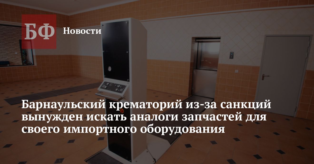 В Барнаульском крематории на фоне санкций решают проблему с оригинальными запчастями для своего импортного оборудования — чешских печей Tabo CS. Как рассказал ИА «Банкфакс» директор предприятия Андрей Чумаченко, некоторые аналоги найти уже удалось. Между тем одно из предприятий того же профиля в России с такими же аппаратами временно приостановило работу, поскольку пока не может приобрести необходимые детали.
