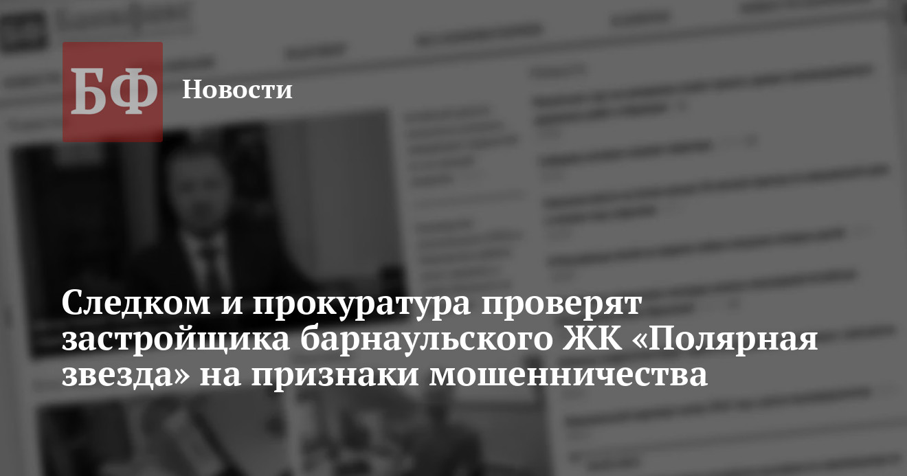 По факту нарушения прав дольщиков жилкомплекса «Полярная звезда» на улице Папанинцев в Барнауле организованы проверки в связи с возможным мошенничеством девелопера и генподрядчика. Об этом сообщили пресс-службы СУ СКР по Алтайскому краю и прокуратуры. Накануне «Банкфакс» писал, что приобретатели будущих квартир обеспокоены судьбой своих вложений на фоне финансовых проблем застройщика, связанного с представителями крупного бизнеса, бывшими и действующими политиками и экс-чиновниками.