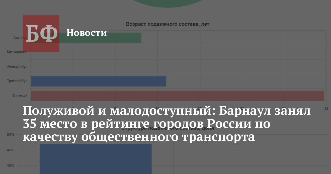 Барнаул занял 35 позицию в рейтинге городов России по качеству общественного транспорта, который по итогам I квартала 2022 года подготовила компания Simetra. Как подсчитали эксперты, средний возраст автобусов в городе — 31,1 лет, троллейбусов — 16,05 лет, а трамваев — 34,75 лет. Доступность к магистральным маршрутам есть только у 55% жителей. Примечательно, что сразу несколько городов Сибири вышли в топ-10: Новокузнецк, Кемерово, Новосибирск и Красноярск.