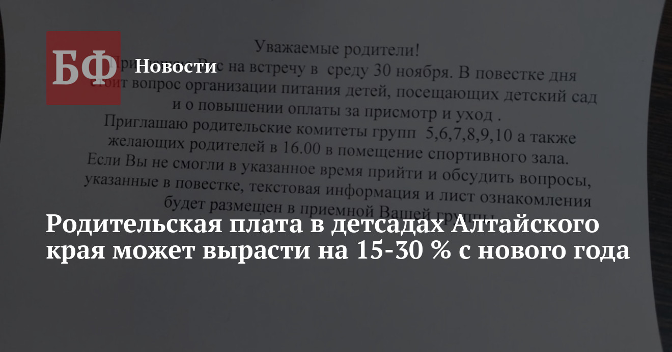 По информации читателей «Толка», сейчас на собраниях в детсадах региона родителей открыто готовят к грядущему росту их платы, однако власти не подтверждают принятие каких-либо решений по этому поводу. Так, председатель комитета по образованию и науке Алтайского краевого Заксобрания Александр Молотов сообщил «Толку», что решений о возможном повышении платы за детские сады в регионе пока не принималось: «Все необходимые подсчеты были сделаны еще в мае текущего года. После этого прошли круглые столы и совещания. Появилось понимание, что плату за детсады повышать необходимо. Но именно тогда раскрутился маховик инфляции и возник вопрос, смогут ли родители потянуть это повышение».
