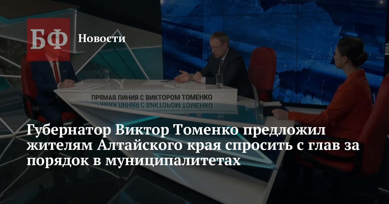 Глава Алтайского края Виктор Томенко, отвечая на поступившее в ходе прямой линии обращение бийчанина, пожаловавшегося на замусоренность городских территорий, предложил спросить с глав муниципалитетов по данным случаям. Он подчеркнул, что вопросы такого рода входят в компетенцию органов местного самоуправления, при этом поскольку они попадают на краевой уровень и выше, усомнился в эффективности усилий местных властей.