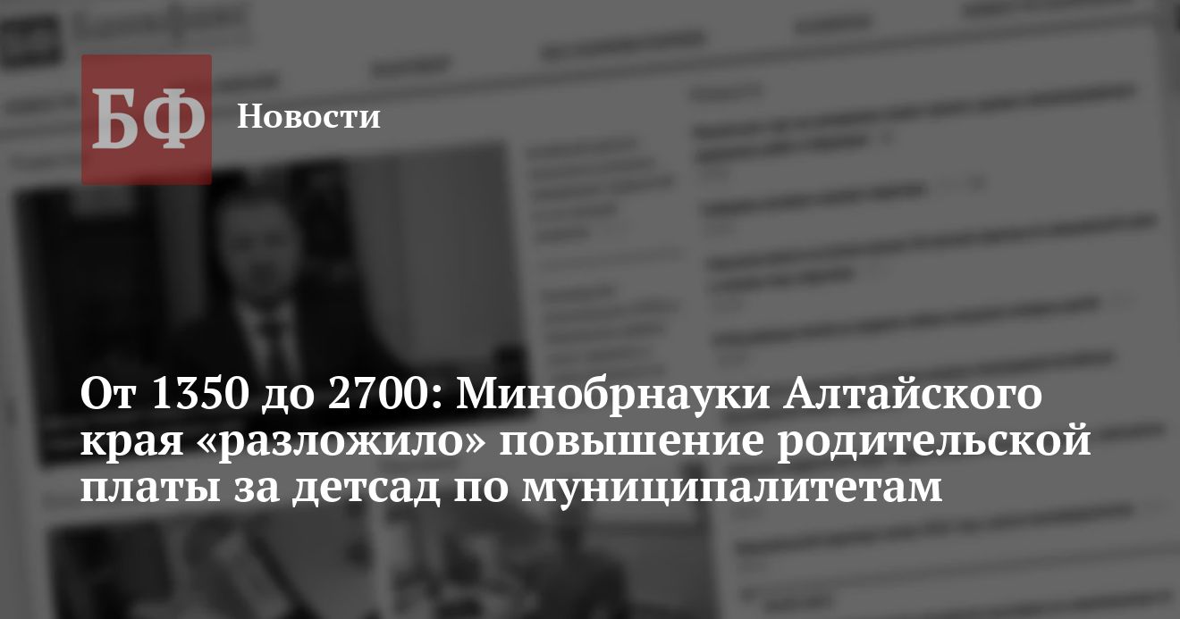 Из релиза ведомства следует, что самая низкая плата с 1 января 2023 года будет установлена в Суетском районе — 1350 рублей, а самая высокая — в размере 2700 рублей — в Барнауле, Бийске, Рубцовске, Новоалтайске и ЗАТО Сибирском. Прежние размеры платы министерство не уточнило, но известно, что на данный момент в Барнауле, Бийске и Рубцовске родительская плата также является самой высокой в регионе и равняется 2000 рублям.