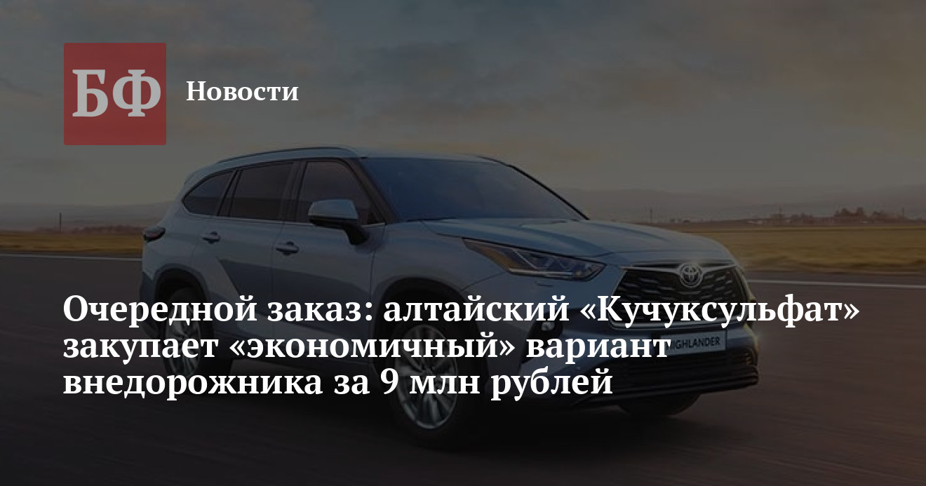 7 февраля ОАО «Кучуксульфат» объявило о поиске поставщика Toyota Highlander. Как следует из техзадания, руководству предприятия в Благовещенском районе требуется ряд конкретных характеристик: мощность двигателя 240−249 л/c экологического класса Евро-5, шесть V-образных цилиндров, полный привод, автоматическая восьмиступенчатая коробка передач.