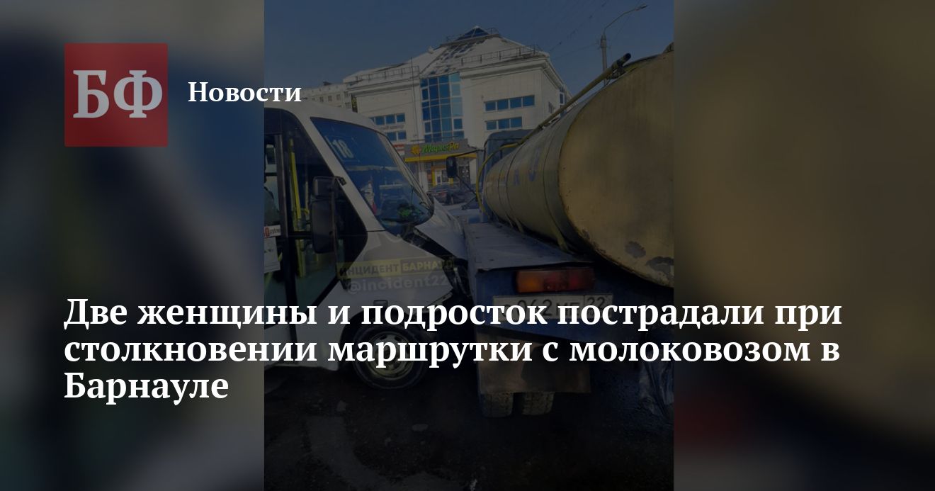 В Барнауле маршрутный автобус № 18 врезался в молоковоз на пересечении улиц Энтузиастов и Панфиловцев. Как сообщили ИА «Банкфакс» в пресс-службе городского подразделения ГИБДД, в результате аварии пострадали три пассажира маршрутки — две женщины и мальчик-подросток.