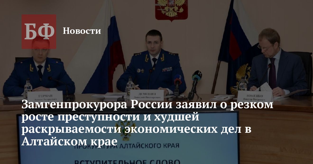 Рост преступности по ряду направлений и самая низкая в Сибири раскрываемость экономических преступлений в Алтайском крае за 2022 год вызвали критику заместителя генерального прокурора России Дмитрия Демешина. Так, он указал, к примеру, что число особо тяжких деяний за год выросло в полтора раза. На эти проблемы он обратил внимание во время свой рабочей поездки в регион — в ходе расширенного заседания коллегии алтайской прокуратуры. Отметим, что эта претензия может быть адресована другим правоохранительным ведомствам, так как прокуроры осуществляют надзор за расследованиями уголовных дел.
