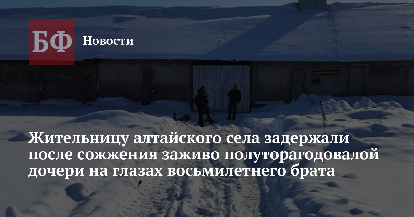 20 февраля в селе Урожайное Советского района оказалась заживо сожжена полуторагодовалая девочка. Как сообщает пресс-служба СУ СКР по Алтайскому, в убийстве ребенка подозревают мать, которую недавно ограничили в родительских правах. Преступление она якобы совершила в присутствии восьмилетнего сына. На данный момент возбуждено уголовное дело, женщину задержали. Также решается вопрос об уголовном производстве по факту действий или бездействия работников органов системы профилактики, в чьи обязанности входил контроль за неблагополучной семьей.