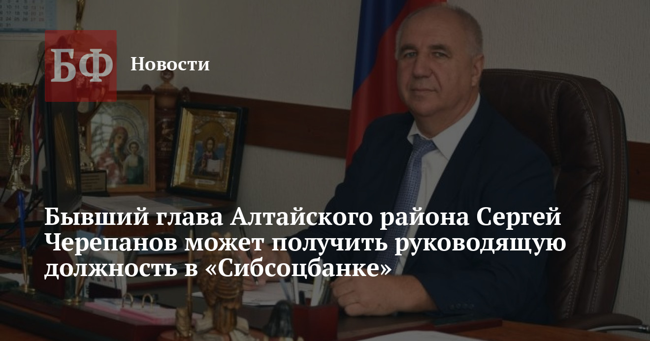 Сергей Черепанов, отказавшийся от борьбы за пост главы Алтайского района, который он занимал несколько лет, рассказал о возможных перспективах дальнейшего трудоустройства. Прощаясь с депутатами на последней сессии, он сообщил, что ему предложили занять руководящую должность в «Сибсоцбанке», а также в ряде других организаций.