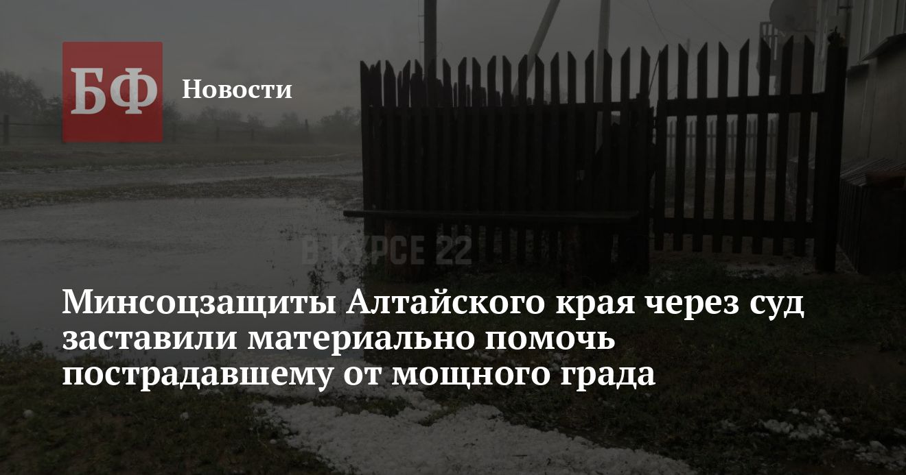 Жителю села Назаровка Михайловского района, где прошлым летом прошел разрушительный град, Минсоцзащиты Алтайского края незаконно отказало в предоставлении материальной помощи, которая оказывалась по решению губернатора Алтайского края. Как сообщает пресс-служба прокуратуры региона, чтобы защитить права гражданина, ведомство обратилось в суд и выиграло дело. На данный момент мужчина получил положенные ему средства — 27 008 рублей.