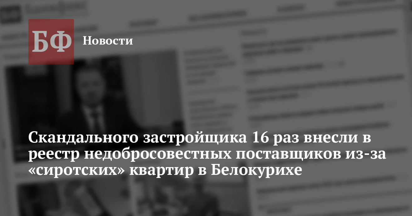 ООО «ГазТеплоСнаб» скандального застройщика Евгения Клейнатовского внесли в реестр недобросовестных поставщиков из-за несостоявшейся поставки квартир для детей-сирот по закупке КГКУ «Региональное жилищное управление» (РЖУ). Притом, как пишет пресс-служба УФАС по Алтайскому краю, внесли компанию в список неблагонадежных сразу 16 раз — по одному за каждый непоставленный объект недвижимости.