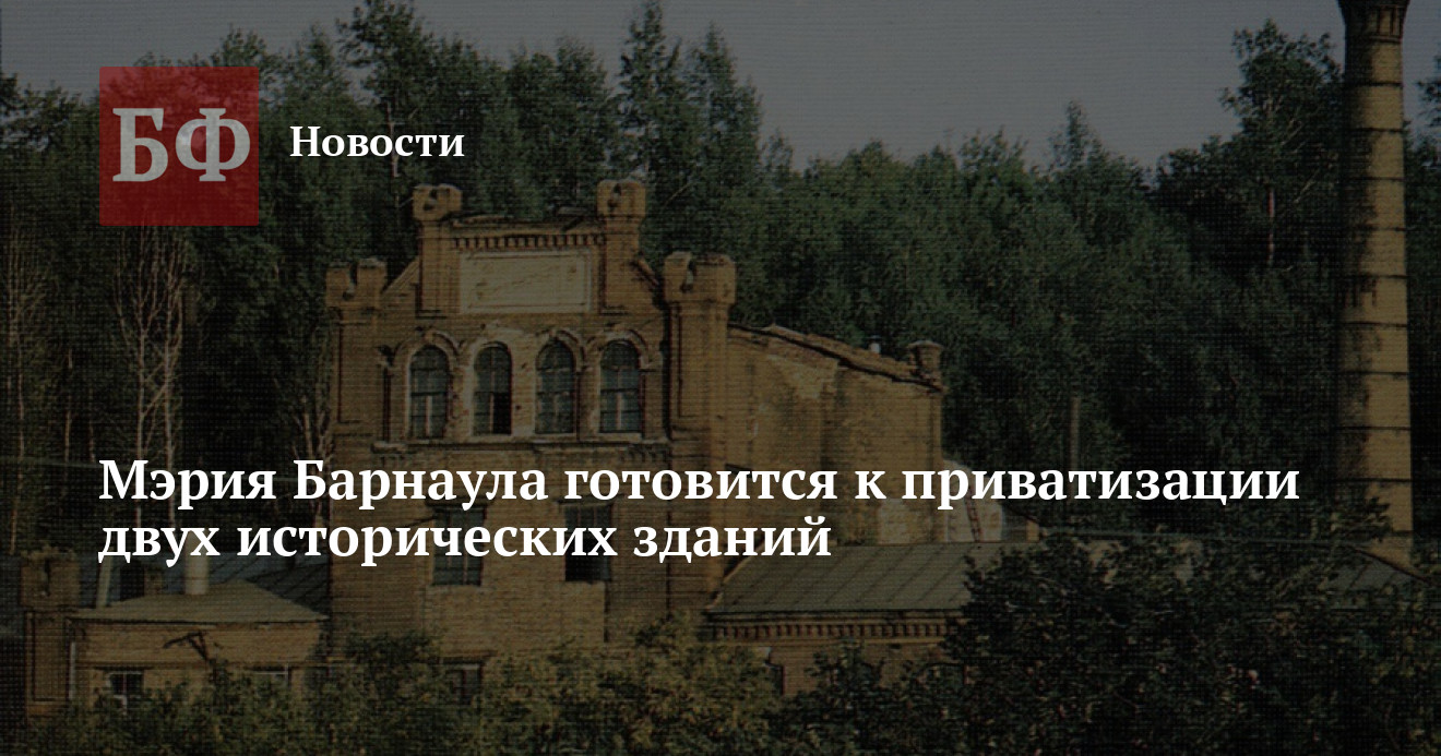 Администрация Барнаула планирует приватизировать два исторических здания — жилой дом на улице Пушкина, 45 и производственный корпус дрожже-винокуренного завода Зверева на улице Мамонтова, 305 «А». Об этом сообщили в мэрии в ответ на запрос ИА «Банкфакс». Как пояснили власти, именно перспективой передачи в частные руки объясняется разработка научно-проектной документации по сохранению этих объектов культурного наследия.