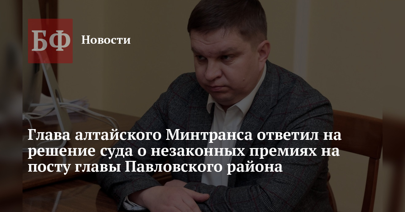 Министр транспорта Алтайского края Антон Воронов отреагировал на публикацию «Банкфакса» о судебном решении, по итогам которого с него взыскали более 300 тысяч рублей незаконно полученных премий в период работы главой Павловского района. На своей странице «ВКонтакте» он заявил, что не согласен с позицией инстанции, и это разбирательство якобы безосновательно. По его словам, порядка согласования премиальных не существует, а значит, он ничего не нарушил. Сам факт выплат он не отрицает.