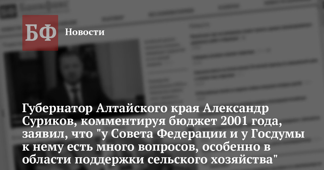 Как сообщили в пресс-службе администрации края, 13 сентября в Москве глава администрации края Александр Суриков принял участие в работе комитета Совета Федерации по бюджетной политике. Основная тема заседания — бюджет России на 2001 год. Днем раньше он обсуждал этот же вопрос с депутатами Государственной Думы из агропромышленной группы. По мнению Александра Сурикова, прохождение бюджета через Думу выглядит не так оптимистично, как это предполагают некоторые федеральные средства массовой информации. И у Совета Федерации, и у Государственной Думы есть к бюджету немало вопросов, особенно в области поддержки сельского хозяйства.