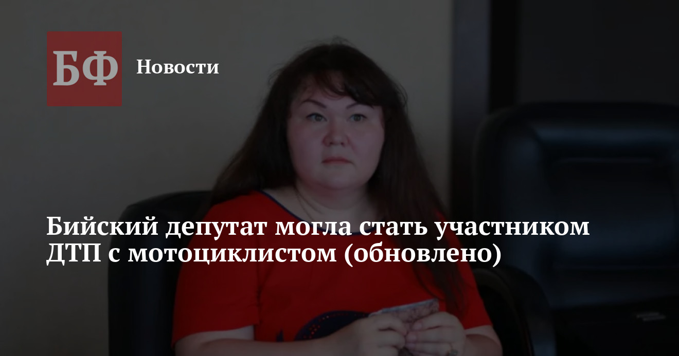 В Бийске 5 мая произошло ДТП, в котором, по некоторым данным, могла участвовать депутат Городской Думы Диана Чуй. Об этом сообщают источники ИА «Банкфакс». В пресс-службе краевой Госавтоинспекции говорят, что пока не располагают никакой информацией о случившемся. В то же время председатель Думы Сергей Ларейкин говорит, что его коллега была лишь свидетелем инцидента.