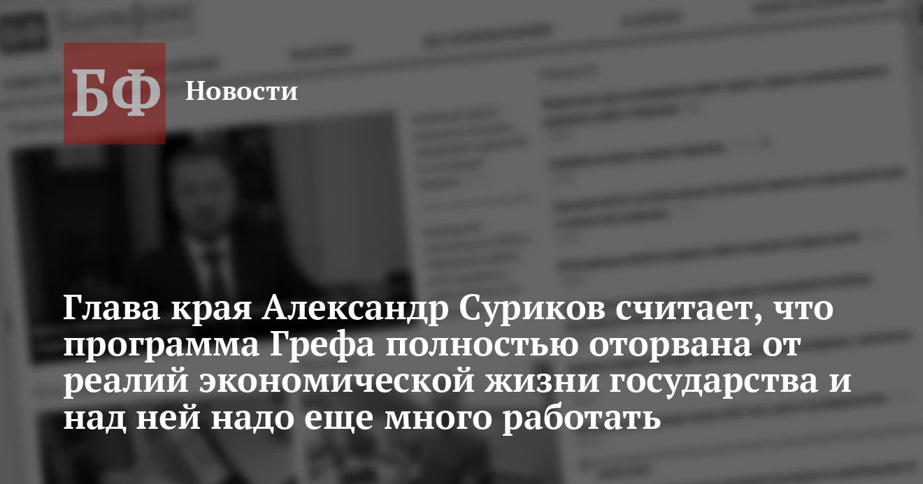 Как сообщили в пресс-службе администрации края, резкой критике на состоявшемся заседании Совета Федерации подверглась программа экономического развития России до 2010 года, представленной министром экономического развития и торговли РФ Германом Грефом. Как сообщил 28 сентября по телефону из Москвы глава администрации края Александр Суриков, программа полностью оторвана от реалий экономической жизни государства и над ней надо еще много работать как с привлечением комитетов Государственной Думы и Совета Федерации, так и отраслевых министерств правительства РФ.