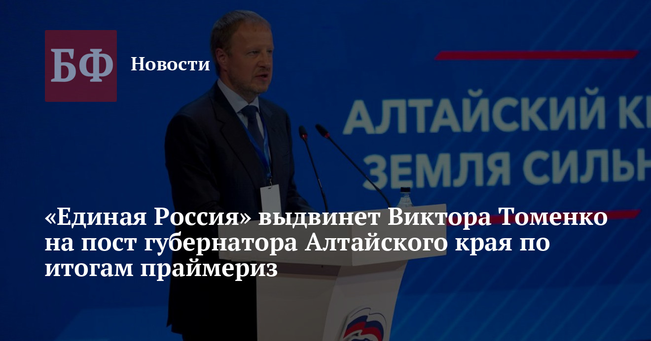 13 июня состоялась конференция алтайского реготделения «Единой России», на которой подвели итоги праймериз. За выдвижение на пост губернатора боролись председатель комитета Заксобрания по аграрной политике, природопользованию и экологии Сергей Серов, уполномоченный по защите прав предпринимателей в крае Андрей Осипов и действующий глава региона Виктор Томенко. Последний одержал победу по результатам тайного голосования делегатов. Как распределились голоса выборщиков, не уточняется. Президиум регионального политсовета партии утвердил данное решение и объявил, что Томенко будет баллотироваться на второй срок от ЕР.