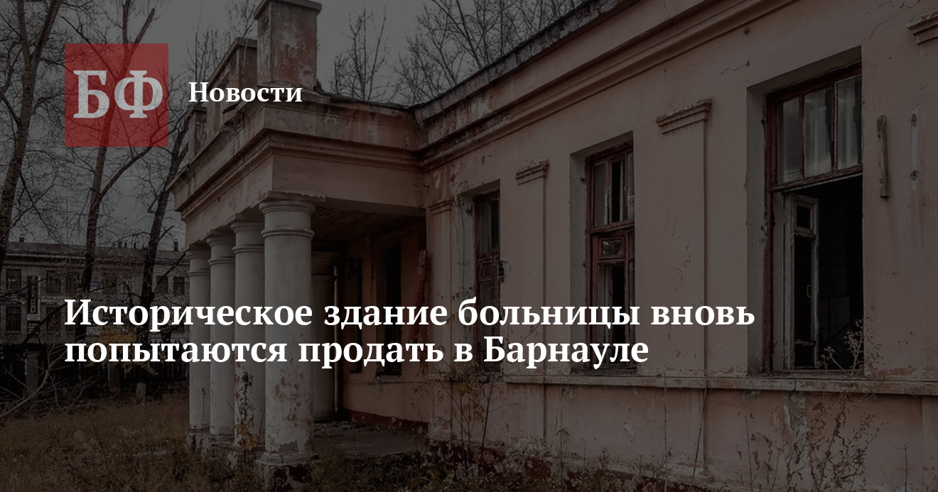 В Барнауле продают историческое здание больницы 1936 года постройки. Строение располагается на улице Калинина, 24 и входит в Единый государственный реестр объектов культурного наследия. Сейчас здание пребывает в плачевном состоянии и нуждается в реставрации. Начальная цена продажи превышает 5,8 млн рублей, говорится на сайте torgi.gov.ru. Ранее здание больницы уже неоднократно пытались реализовать, но эти попытки не увенчались успехом.