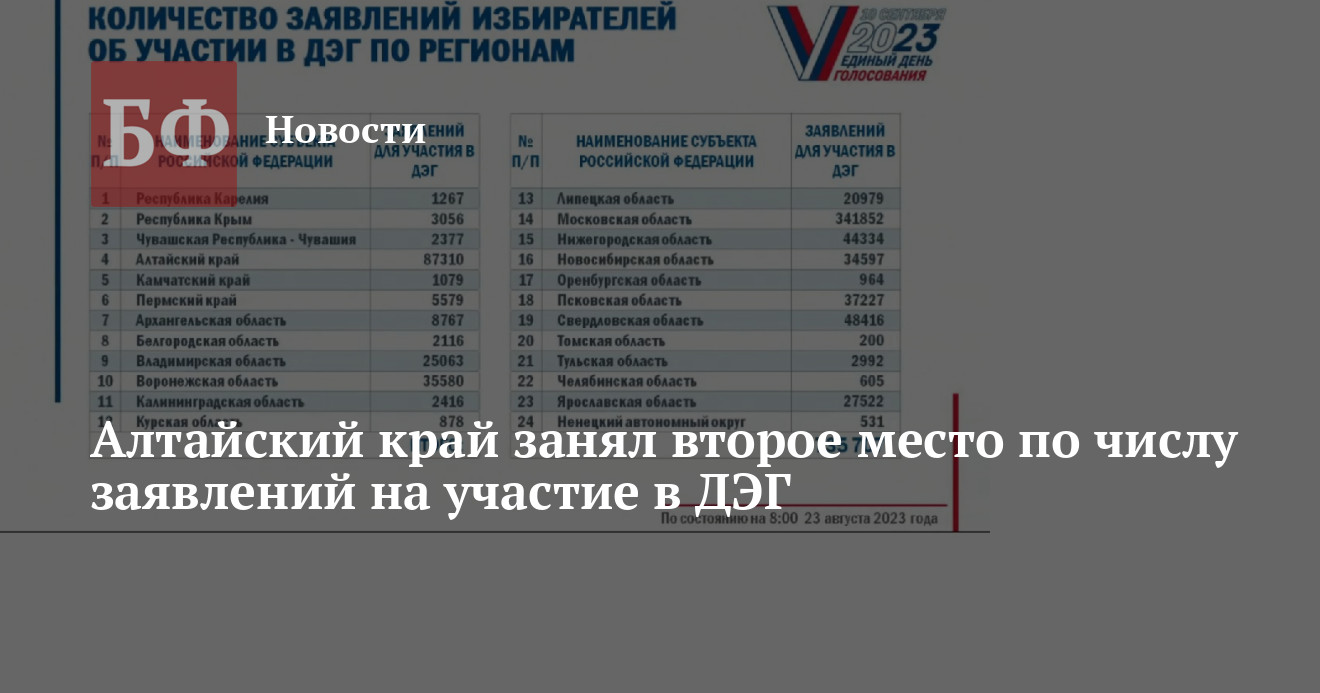 По данным на 23 августа, 87 310 избирателей Алтайского края подали заявление для регистрации на дистанционное электронное голосование, которое в регионе пройдет впервые. Это второй результат из 24 регионов после Московской области, где в ДЭГ намерены поучаствовать 341 852 человека (Москва не учитывается, поскольку онлайн-процедура здесь проходит на отдельной платформе). В первую пятерку субъектов также вошли Свердловская (48 416 заявлений), Нижегородская (44 334) и Псковская (37 227) области. В общей сложности на выборах 2023 года в ДЭГ решили принять участие 735 707 человек.