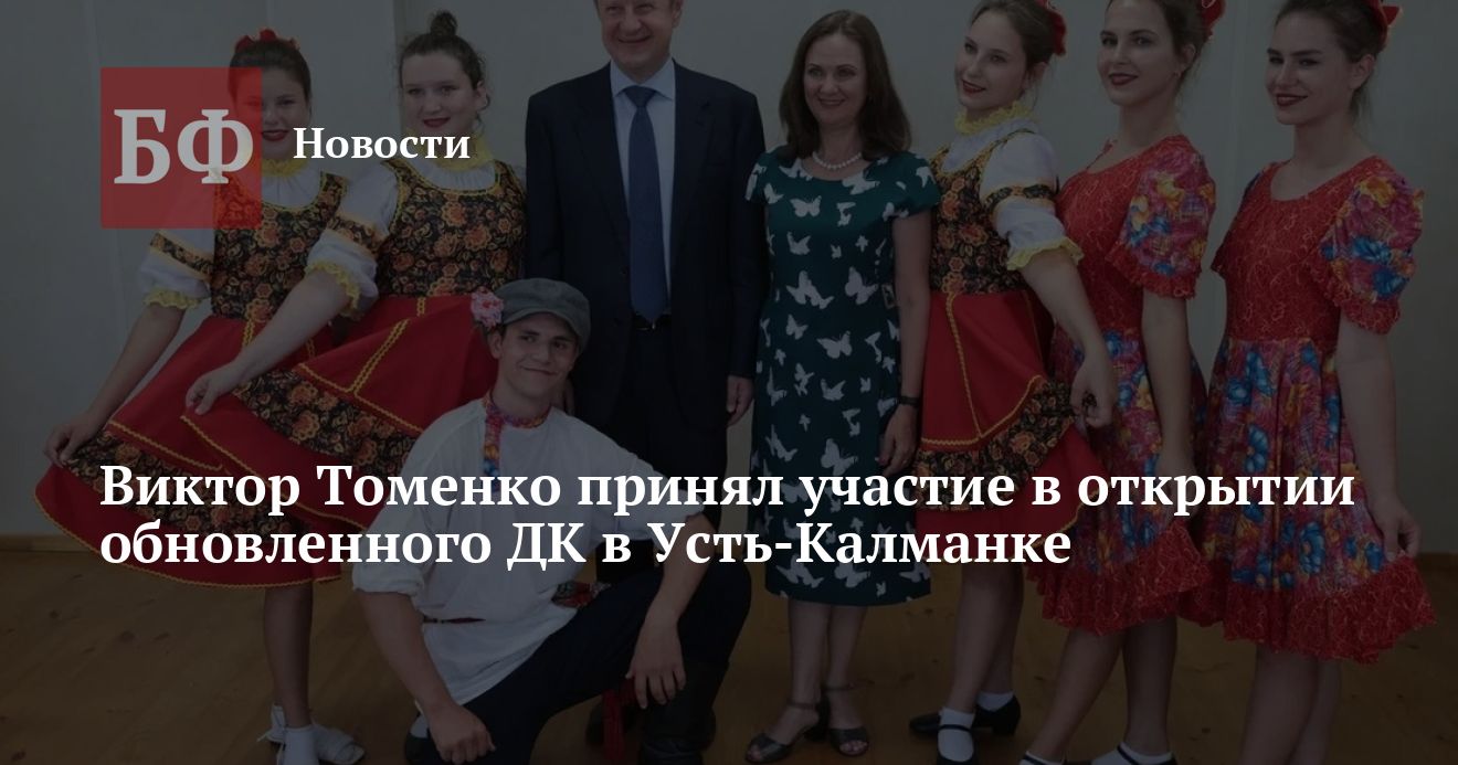 25 августа Виктор Томенко принял участие в открытии дома культуры в Усть-Калманке после капитального ремонта. На обновление объекта из краевого бюджета было направлено более 82 млн рублей. В ходе торжественной церемонии губернатор подчеркнул, что подобная работа ведется по всему краю. За последние годы благодаря различным федеральным и краевым программам удалось привести в порядок свыше 300 учреждений.