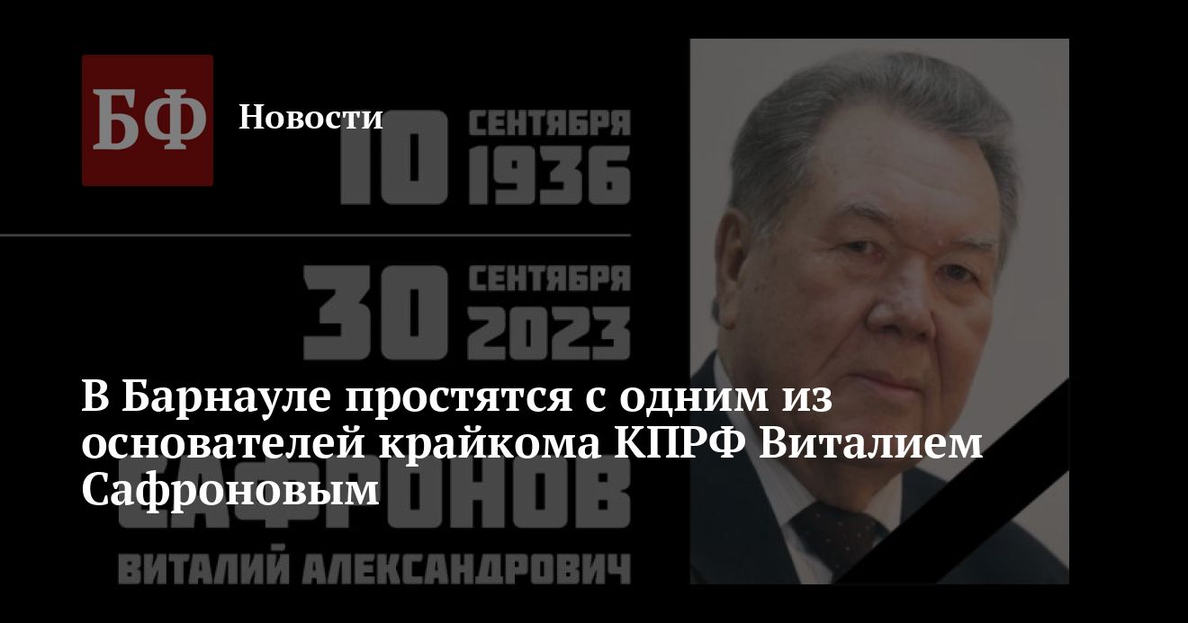 30 сентября на 88-м году жизни скончался ветеран коммунистической партии, один из основателей алтайского крайкома КПРФ, бывший депутат Госдумы и Алтайского Заксобрания Виталий Сафронов. Депутат Барнаульской гордумы Юрий Красильников сообщил «Банкфаксу», что прощание состоится 3 октября.