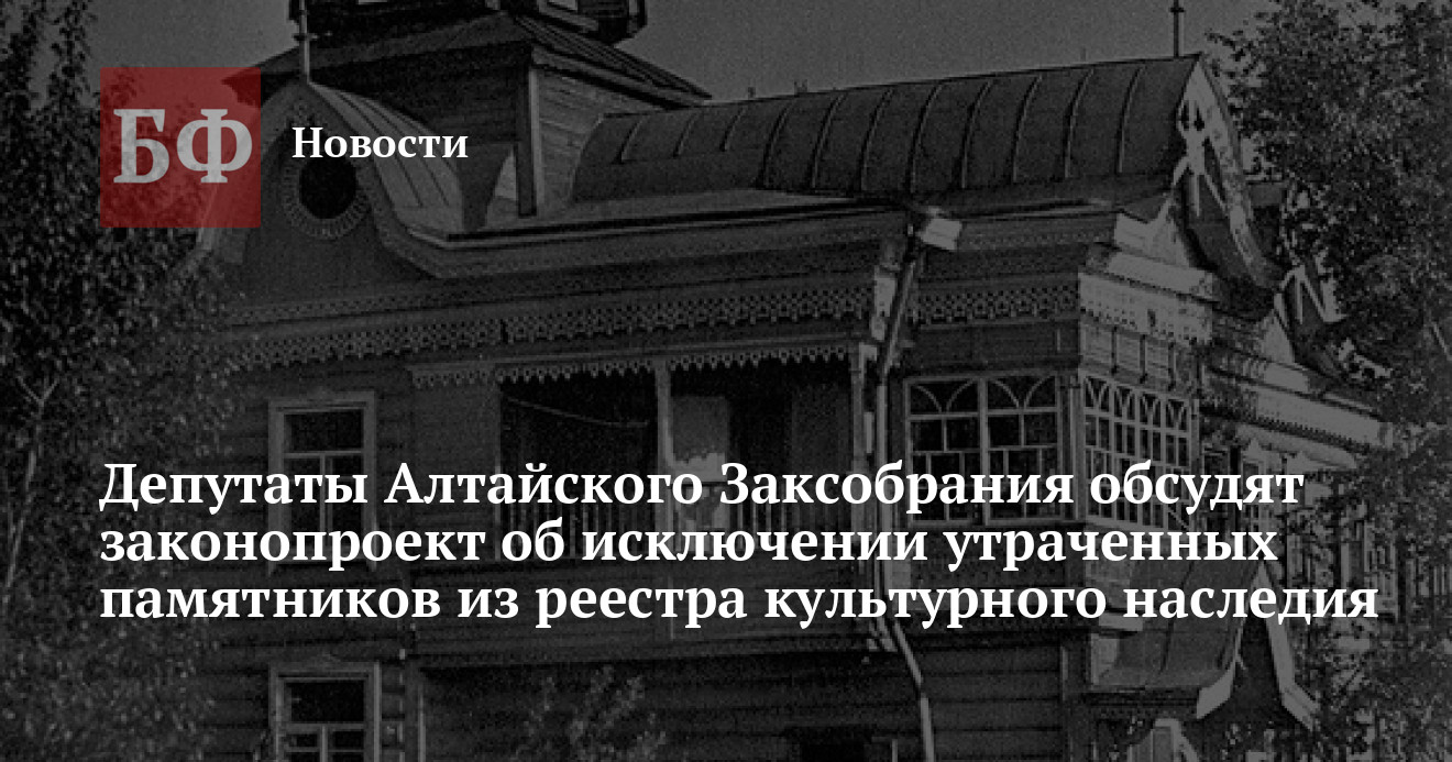11 октября пресс-служба Алтайского Заксобрания сообщила о том, что депутаты готовят отзыв на проект федерального закона «О внесении изменений в ФЗ «Об объектах культурного наследия (памятниках истории и культуры) народов РФ». Законопроект разработало и внесло в Госдуму Заксобрание Тверской области. Перед рассмотрением ГД направила документ в регионы для обсуждения и дачи отзыва.