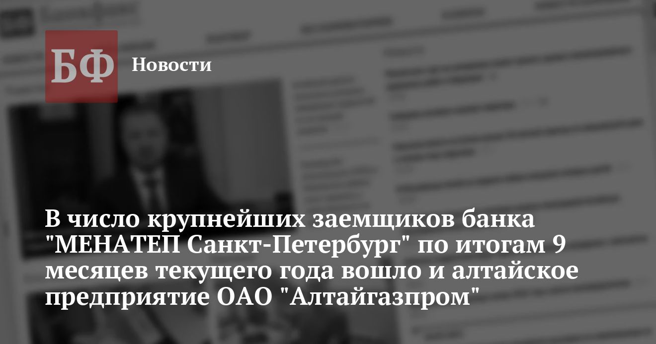 По данным пресс-службы банка «МЕНАТЕП Санкт-Петербург» кредитование является приоритетным направлением деятельности банка За 9 месяцев текущего года кредитные вложения «МЕНАТЕП Санкт-Петербург» увеличились с 5 025 млн рублей до 10 940 млн рублей. Основными заемщиками банка, по-прежнему, являются предприятия и организации реального сектора экономики. В число таких крупнейших заемщиков банка как — ОАО «Востокгазпром», ООО «Севергазпром», ОАО «Стройтрансгаз», АООТ «УАЗ», ОАО «Красноярскнефтепродукт», ОАО «Мурманское морское пароходство» и др. — вошло и алтайское предприятие ОАО «Алтайгазпром».