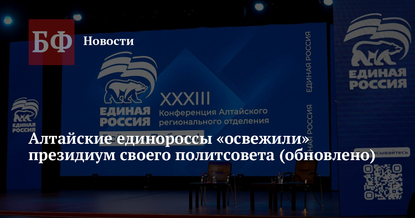 На XXXIII конференции реготделения ЕР присутствовали 175 делегатов, в том числе губернатор Алтайского края Виктор Томенко. Главным вопросом стало обновление руководящих органов парторганизации. Состав его политсовета ежегодно должен обновляться не менее, чем на 10%. Зачастую эта ротация затрагивает персонажей, покинувших политический олимп в силу ряда причин, в том числе интереса правоохранителей. Сейчас в него входят 115 человек, и единороссы прекратили полномочия 19 из них. Кого конкретно — не уточняется. Изменения пока не отражены на сайте партии. Тем не менее, партийцы упоминают некоторых новоизбранных членов РПС, в том числе депутата Алтайского Заксобрания Дмитрия Беляева, министра цифрового развития и связи края Евгения Зрюмова и главу Бийска Виктора Щигрева. Состав президиума политсовета также претерпел косметические изметения. Его покинули заместитель гендиректора АО «Курорт Белокуриха» Олег Акимов, экс-глава Алтайского краевого Отделения пенсионного фонда Борис Трофимов и глава Первомайского района Юлия Фролова. Им на смену пришли депутат АКЗС Николай Данилин, начальник управления Алтайского края по развитию предпринимательства и рыночной инфраструктуры Александр Евстигнеев, а также спикер Бийской гордумы Сергей Ларейкин.