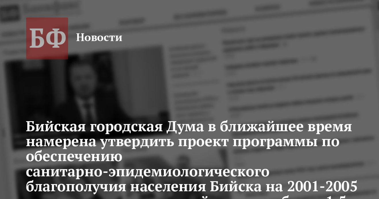 «Программа по обеспечению санэпидблагополучия на 2001−2005 годы» была принята депутатами бийской Думы в первом чтении. В течение двух месяцев она должна быть доработана и окончательного утверждена.